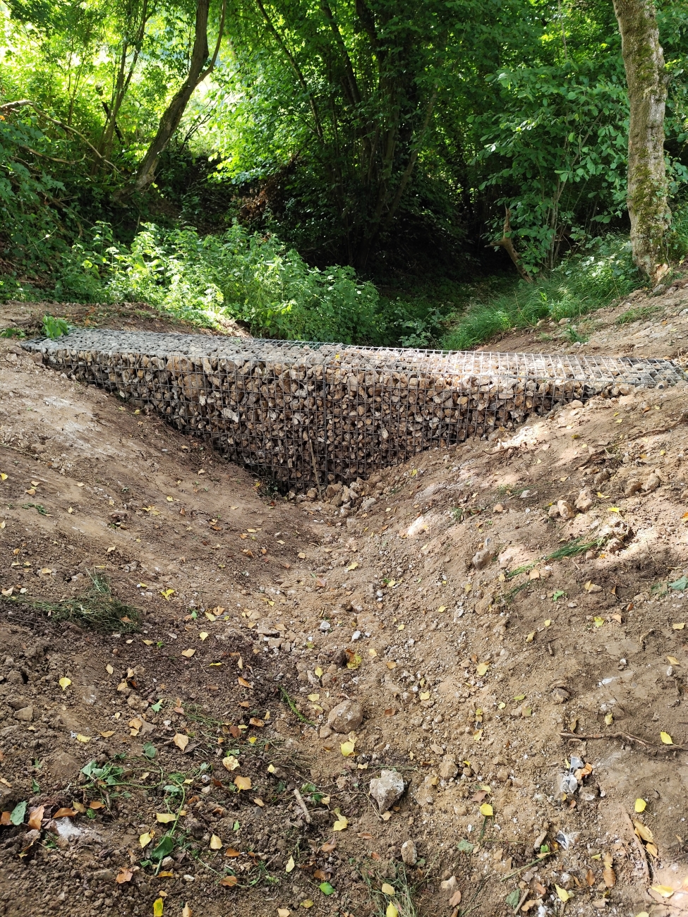 La deuxième phase des travaux s’est achevée en juillet 2025, elle visait à ralentir les flux dans les ravins. Pour cela, sept gabions (casiers en fer remplis de pierres) ont été installés. À cela s’ajoute la reprise d’un fossé de 105 ml, composé de zones plus profondes permettant de stocker l’eau à la sortie des ravins avant son entrée dans le village. Des saignées ont également été réalisées le long de la route en amont de la rue du Rossignol afin de rediriger les eaux vers une prairie, zone qui permet d’infiltrer les eaux.