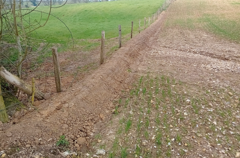 La première phase des travaux a débuté en hiver 2024. Deux talus, pour un total de 120 ml, ont été créés, sur lesquels des haies ont été implantées. Elles favorisent une meilleure infiltration des eaux de ruissellement et stabilisent la structure des talus grâce à leur système racinaire, dans le but de casser la vitesse de l’eau vers les ravins en aval.